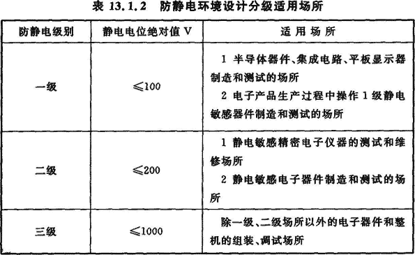 13.1.2 防靜電環(huán)境設計應按電子產(chǎn)品或生產(chǎn)工序(設備)進(jìn)行分級。防靜電環(huán)境內靜電電位絕對值應小于電子產(chǎn)品的靜電電位安全值。防靜電環(huán)境設計應分為三級,防靜電環(huán)境設計分級適用場(chǎng)所應符合表13.1.2的要求。