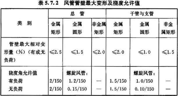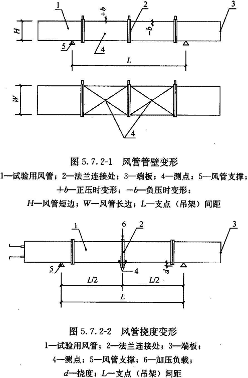 10 外購成品風(fēng)管應有變形試驗。風(fēng)管管壁最大變形相對量(表面最大不平度b與風(fēng)管短邊長(cháng)度H之比,圖5.7.2—1)及撓度角允許值[兩段風(fēng)管組合件中央連接法蘭部位的撓度量d與該兩風(fēng)管組合的兩吊架(支點(diǎn))間距一半L/2之比,見(jiàn)圖5.7.2—2]應符合表5.7.2的規定。