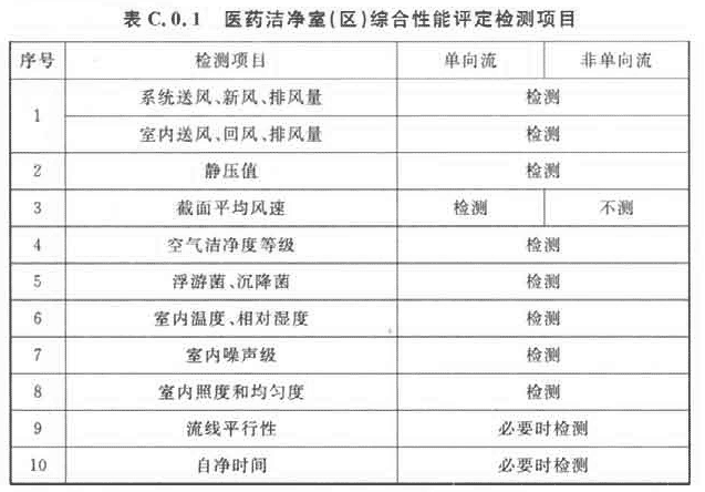 4 醫藥潔凈室(區)的綜合性能確認,應包括表C.0.1項目的檢測和評價(jià)。