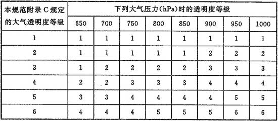 4.3.4 采用本規范附錄C和附錄D時(shí),當地的大氣透明度等級應根據本規范附錄E及夏季大氣壓力按表4.3.4確定。