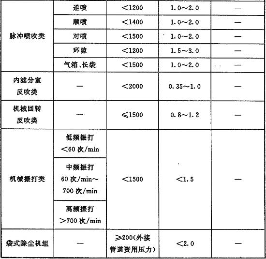 2 袋式除塵器的運行阻力宜為1200Pa~2000Pa,初阻力接近下限值,終阻力接近上限值。
